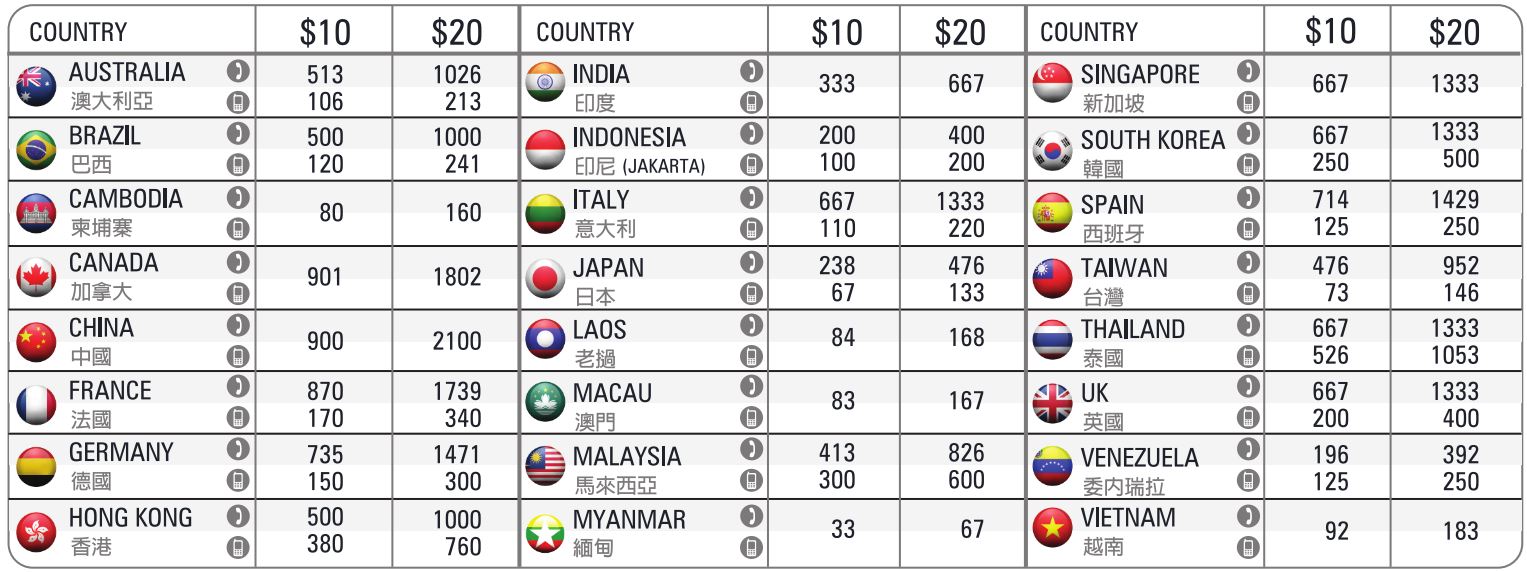 同样可以拨打其他国家,具体费率请见下表。请注意一些国家的固定电话与手机的费率是不同的。如果您有任何疑问,欢迎您与我们联系。